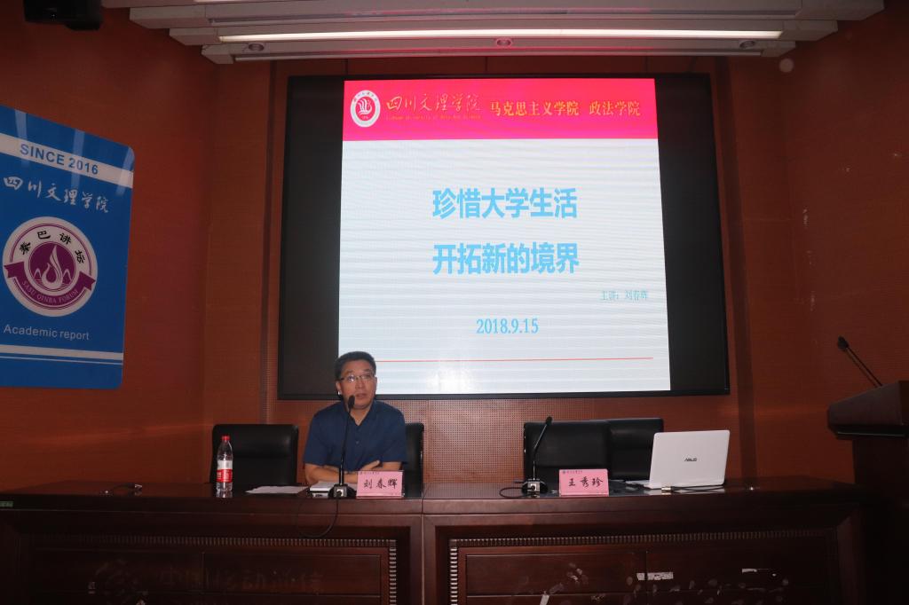 首先刘春辉书记向新生们简单的介绍了学校概况和军训的情况。其次刘书记从“德、智、体、美、劳”五个方面,结合生活中的点滴阐述了它们的内涵和外延,告诉同学们要把握大学时光,珍惜大学生活。然后刘书记建议同学们要养成持之以恒坚持不懈的精神,找到适合自己的学习,要做到劳逸结合不能读死书,积极参加学校活动。然后,唐幸福老师给同学们讲解了学校规章制度,学籍管理。最后,刘丹老师详细讲解了国家奖助优评选注意事项。