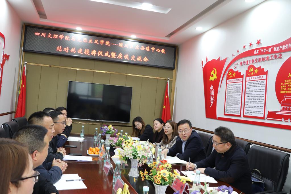 随后,刘春辉、孙杰一行与通川区东岳镇中心校班子成员及骨干教师进行了交流座谈。李顺校长首先介绍了东岳镇中心校总体办学情况和近年来取得的优秀成绩,希望能够借助四川文理学院金年会jinnianhuicom这一平台,依托各自的资源和优势推动育人合力的形成。他希望后续工作中加强沟通交流,积极探索协同共建机制,努力将思政课一体化建设落到实处、取得实效。双方教师进行了交流发言,并针对如何深入开展“大中小学思政课一体化建设”谈了各自的看法,提出了许多好的意见建议。