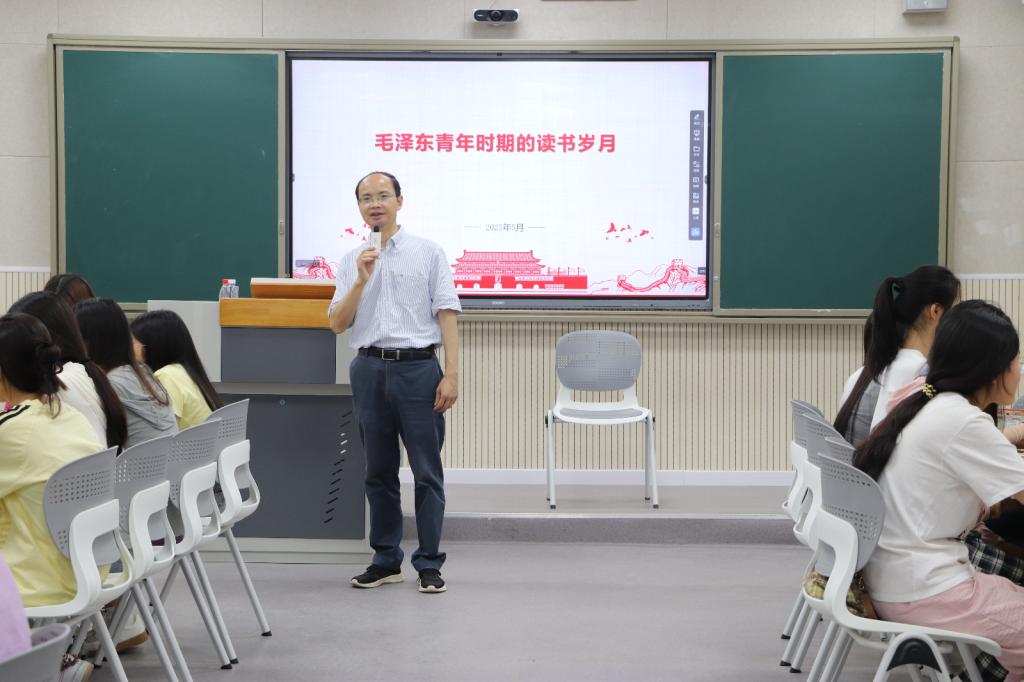 课程中,黄涛书记从“求学经历、读书体验、方法探究和当代启示”四个方面系统讲述了毛泽东青年时期的读书历程及其现实意义。并组织学生进行小组讨论和发言。各小组从毛主席的读书岁月、书籍分类、读书方法及对当代青年的启示等方面进行讨论。认为读书是知识积累与思想觉醒的过程,应广泛涉猎并深入钻研,不要“死读书”也不能“读死书”。