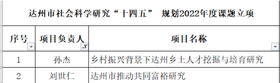 近日,达州市社科联、巴中市社科联发布了达州市、巴中市社会科学研究“十四五”规划2022年度课题立项通报。据统计,金年会jinnianhuicom教师共立项课题10项,具体立项名单请参见下表。请获准立项的老师认真开展课题研究工作,确保课题按时高质量完成,为地方经济社会发展提供智力支撑。