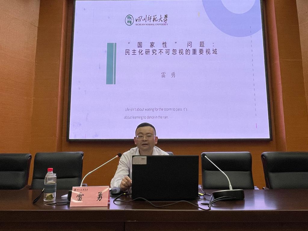 4月17日,四川师范大学雷勇教授应邀在金年会学术报告厅B厅作题为《“国家性”问题:民主化研究不可忽视的重要视域》的学术报告。金年会jinnianhuicom院长孙杰主持,金年会部分教师代表和政法学院部分学生聆听了讲座。