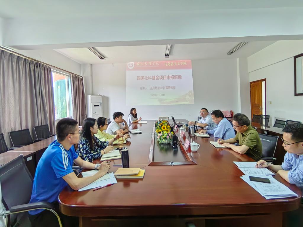 4月18日,四川师范大学雷勇教授应邀在金年会博文楼611会议室作国家社科基金项目申报解读。金年会jinnianhuicom院长孙杰教授主持,金年会jinnianhuicom党委书记刘春辉、学校部分博士代表和部分青年教师代表出席会议。